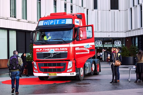 Lastbilkaravane-lastbil foran FN Byens indgang i København.