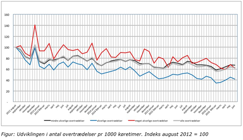 - Antallet af køre- og hviletidsovertrædelser for det seneste halvår er nedbragt markant, og det er glædeligt at se, at der især i antallet af meget alvorlige overtrædelser er sket et drastisk fald på 58 procent siden 2012. Nedgangen i antal overtrædelser kommer ene og alene fra virksomhederne selv, der bruger de data, vi leverer, som en del af styringen i deres virksomhed. De oplever, at de står med et værktøj, der giver dem overblik og handlekraft i forhold til at nedbringe antallet af sager i den enkelte virksomhed, siger Lars Nielsen, chefkonsulent i ITD.